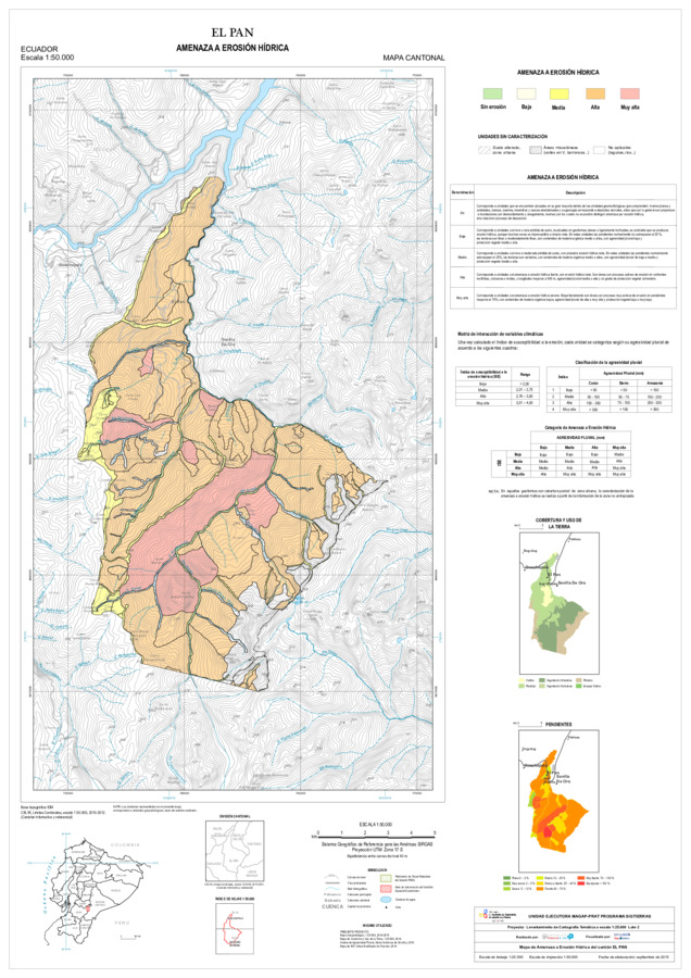 El mapa de Amenaza a erosión hídrica, con formato vector, se genera dentro del proyecto 'Levantamiento de cartografía temática a escala 1:25.000, Lotes 1 y 2', realizado por el Consorcio TRACASA-NIPSA por contrato de la UE MAGAP PRAT - SIGTIERRAS, Programa del Ministerio de Agricultura, Ganadería, Acuacultura y Pesca (MAGAP). Esta cartografía contiene información sobre la posibilidad de ocurrencia de erosión hídrica en la unidad de estudio, la unidad edáfica, del cantón 'EL PAN'.