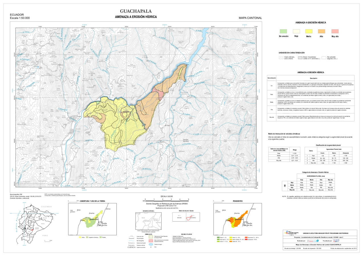 El mapa de Amenaza a erosión hídrica, con formato vector, se genera dentro del proyecto 'Levantamiento de cartografía temática a escala 1:25.000, Lotes 1 y 2', realizado por el Consorcio TRACASA-NIPSA por contrato de la UE MAGAP PRAT - SIGTIERRAS, Programa del Ministerio de Agricultura, Ganadería, Acuacultura y Pesca (MAGAP). Esta cartografía contiene información sobre la posibilidad de ocurrencia de erosión hídrica en la unidad de estudio, la unidad edáfica, del cantón 'GUACHAPALA'.