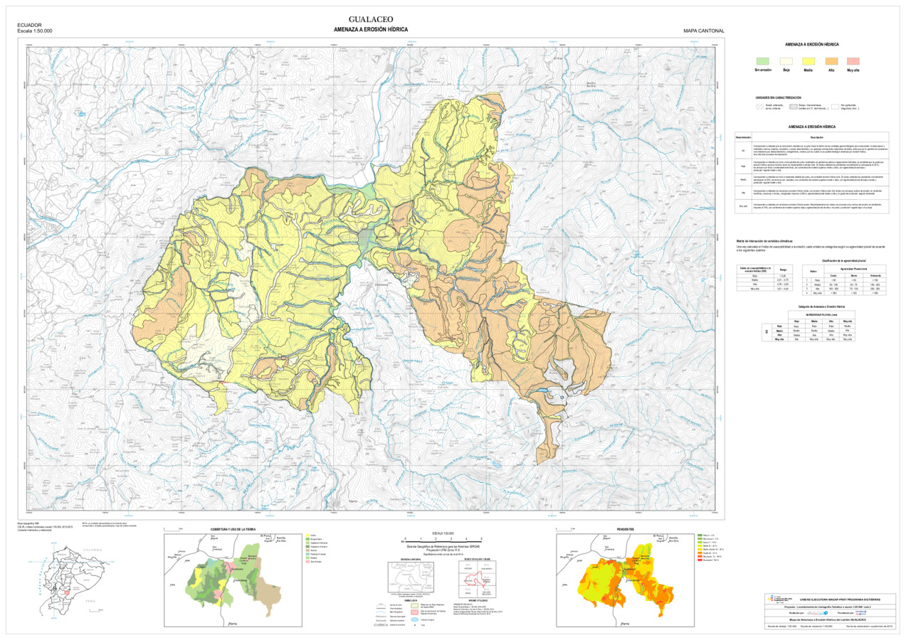 El mapa de Amenaza a erosión hídrica, con formato vector, se genera dentro del proyecto 'Levantamiento de cartografía temática a escala 1:25.000, Lotes 1 y 2', realizado por el Consorcio TRACASA-NIPSA por contrato de la UE MAGAP PRAT - SIGTIERRAS, Programa del Ministerio de Agricultura, Ganadería, Acuacultura y Pesca (MAGAP). Esta cartografía contiene información sobre la posibilidad de ocurrencia de erosión hídrica en la unidad de estudio, la unidad edáfica, del cantón 'GUALACEO'.
