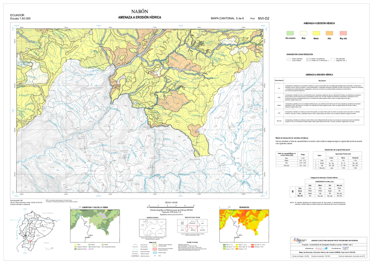 El mapa de Amenaza a erosión hídrica, con formato vector, se genera dentro del proyecto 'Levantamiento de cartografía temática a escala 1:25.000, Lotes 1 y 2', realizado por el Consorcio TRACASA-NIPSA por contrato de la UE MAGAP PRAT - SIGTIERRAS, Programa del Ministerio de Agricultura, Ganadería, Acuacultura y Pesca (MAGAP). Esta cartografía contiene información sobre la posibilidad de ocurrencia de erosión hídrica en la unidad de estudio, la unidad edáfica, del cantón 'NABON'.