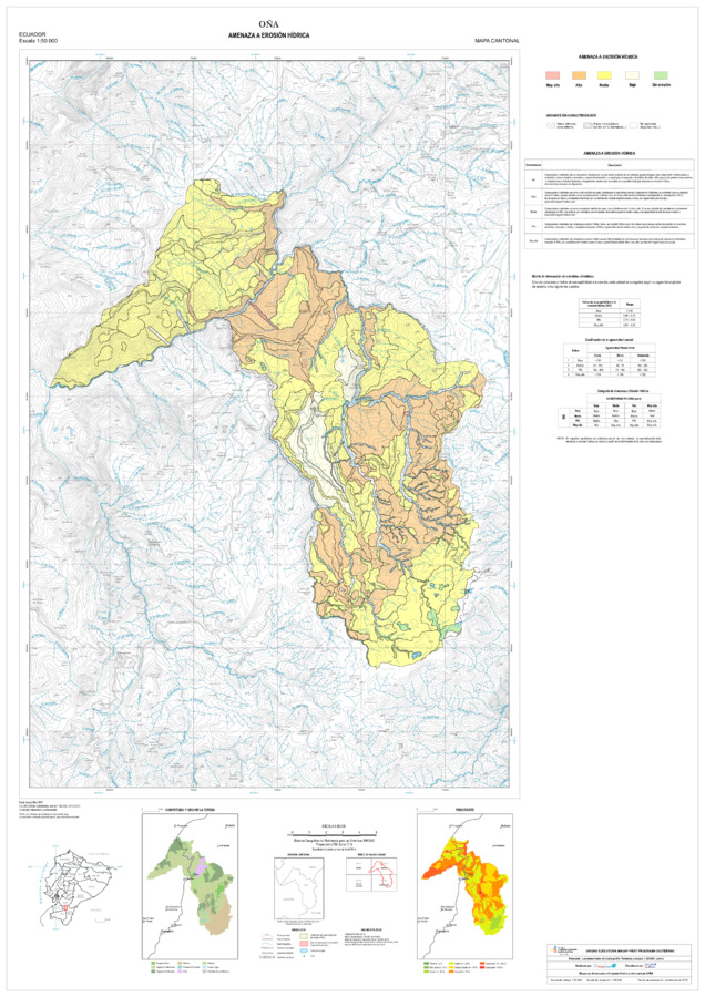 El mapa de Amenaza a erosión hídrica, con formato vector, se genera dentro del proyecto 'Levantamiento de cartografía temática a escala 1:25.000, Lotes 1 y 2', realizado por el Consorcio TRACASA-NIPSA por contrato de la UE MAGAP PRAT - SIGTIERRAS, Programa del Ministerio de Agricultura, Ganadería, Acuacultura y Pesca (MAGAP). Esta cartografía contiene información sobre la posibilidad de ocurrencia de erosión hídrica en la unidad de estudio, la unidad edáfica, del cantón 'OÑA'.