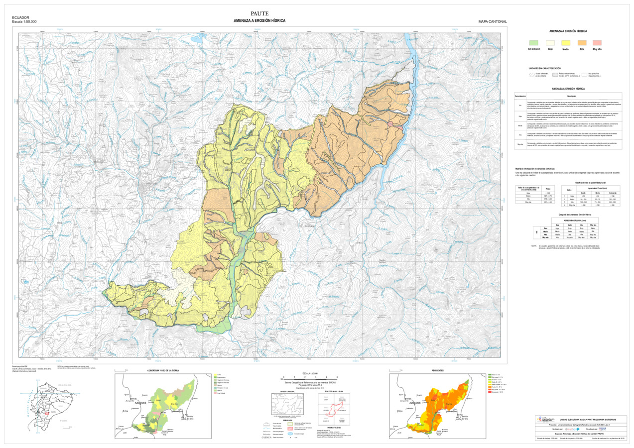 El mapa de Amenaza a erosión hídrica, con formato vector, se genera dentro del proyecto 'Levantamiento de cartografía temática a escala 1:25.000, Lotes 1 y 2', realizado por el Consorcio TRACASA-NIPSA por contrato de la UE MAGAP PRAT - SIGTIERRAS, Programa del Ministerio de Agricultura, Ganadería, Acuacultura y Pesca (MAGAP). Esta cartografía contiene información sobre la posibilidad de ocurrencia de erosión hídrica en la unidad de estudio, la unidad edáfica, del cantón 'PAUTE'.