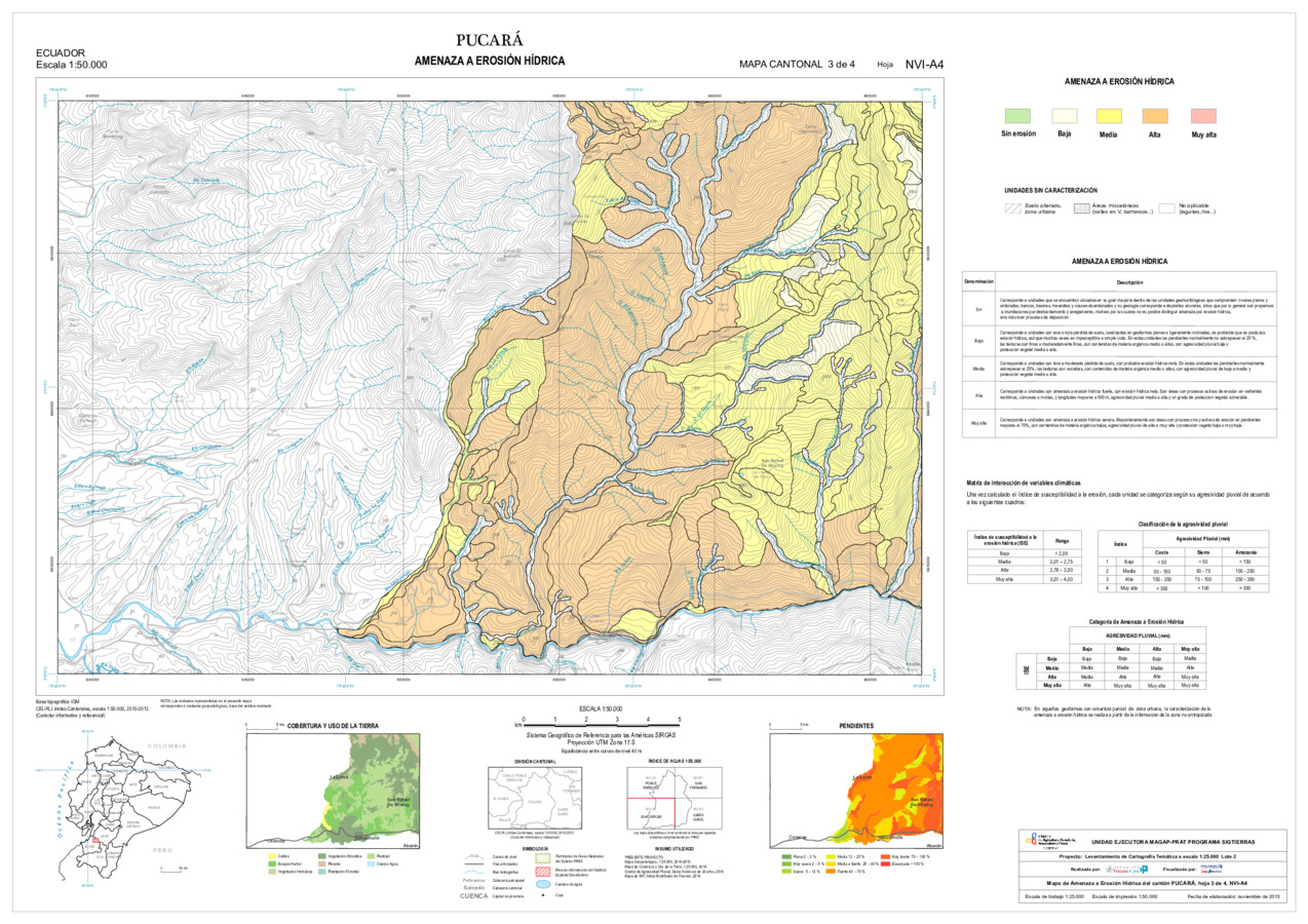 El mapa de Amenaza a erosión hídrica, con formato vector, se genera dentro del proyecto 'Levantamiento de cartografía temática a escala 1:25.000, Lotes 1 y 2', realizado por el Consorcio TRACASA-NIPSA por contrato de la UE MAGAP PRAT - SIGTIERRAS, Programa del Ministerio de Agricultura, Ganadería, Acuacultura y Pesca (MAGAP). Esta cartografía contiene información sobre la posibilidad de ocurrencia de erosión hídrica en la unidad de estudio, la unidad edáfica, del cantón 'PUCARA'.