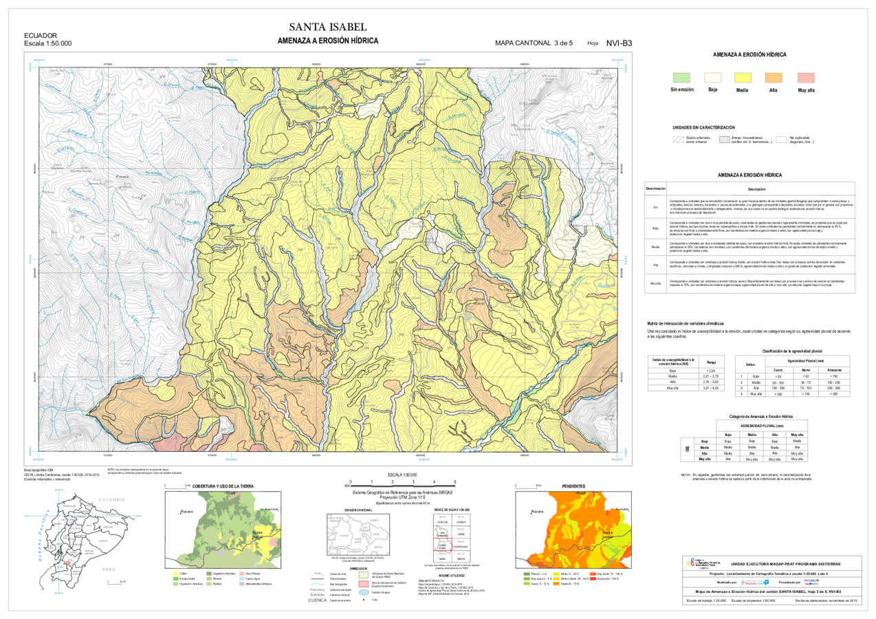 El mapa de Amenaza a erosión hídrica, con formato vector, se genera dentro del proyecto 'Levantamiento de cartografía temática a escala 1:25.000, Lotes 1 y 2', realizado por el Consorcio TRACASA-NIPSA por contrato de la UE MAGAP PRAT - SIGTIERRAS, Programa del Ministerio de Agricultura, Ganadería, Acuacultura y Pesca (MAGAP). Esta cartografía contiene información sobre la posibilidad de ocurrencia de erosión hídrica en la unidad de estudio, la unidad edáfica, del cantón 'SANTA ISABEL'.