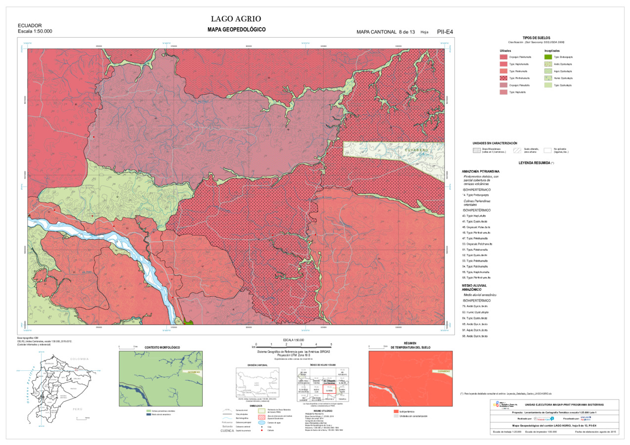 El mapa de Geopedología a escala 1:25.000, con formato vector, se genera en el marco del proyecto de 'Levantamiento de cartografía temática a escala 1:25.000, Lotes 1 y 2', realizado por el Consorcio TRACASA-NIPSA por contrato de la UE MAGAP PRAT - SIGTIERRAS, Programa del Ministerio de Agricultura, Ganadería, Acuacultura y Pesca (MAGAP). Esta cartografía contiene información sobre las características y propiedades de los distintos tipos de suelos que existen en el cantón 'LAGO AGRIO', su clasificación y sus límites en el mapa. En la metodología utilizada se sigue un enfoque geopedológico, basado en la alta correlación que existe entre la geomorfología (formas de relieve) y el suelo. Para la clasificación taxonómica de los suelos se siguen los criterios de la SoilTaxonomy (Claves para la Taxonomía de Suelos, 2006 y 2010), tomando como unidad taxonómica de clasificación el subgrupo y como unidad cartográfica el perfil modal o perfil característico de la unidad edáfica. La base de datos geopedológica consta de 14 variables derivadas de estos resultados de laboratorio para las zonas de semidetalle; en reconocimiento las mismas tienen datos de laboratorio complementadas con datos adquiridos de la información secundaria.