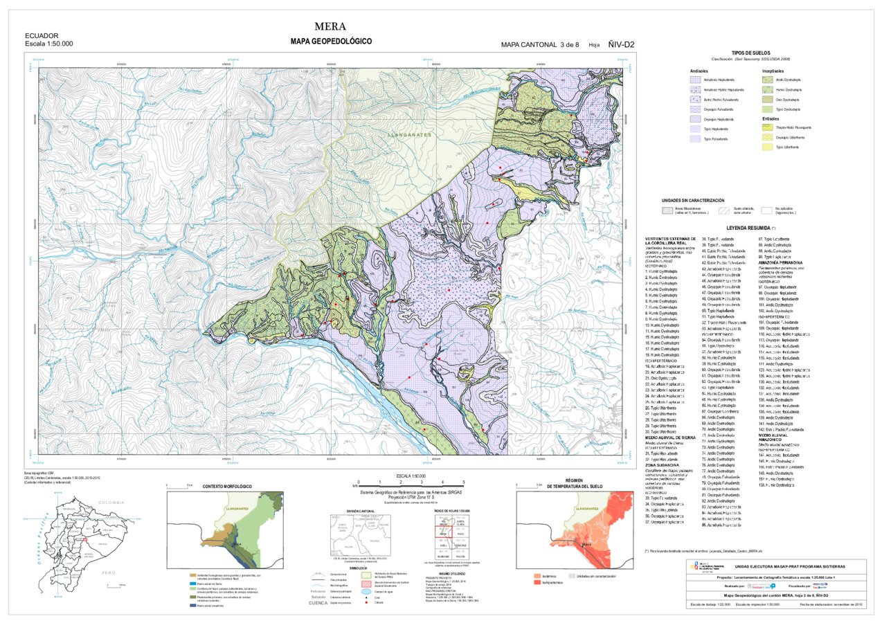 El mapa de Geopedología a escala 1:25.000, con formato vector, se genera en el marco del proyecto de 'Levantamiento de cartografía temática a escala 1:25.000, Lotes 1 y 2', realizado por el Consorcio TRACASA-NIPSA por contrato de la UE MAGAP PRAT - SIGTIERRAS, Programa del Ministerio de Agricultura, Ganadería, Acuacultura y Pesca (MAGAP). Esta cartografía contiene información sobre las características y propiedades de los distintos tipos de suelos que existen en el cantón 'MERA', su clasificación y sus límites en el mapa. En la metodología utilizada se sigue un enfoque geopedológico, basado en la alta correlación que existe entre la geomorfología (formas de relieve) y el suelo. Para la clasificación taxonómica de los suelos se siguen los criterios de la SoilTaxonomy (Claves para la Taxonomía de Suelos, 2006 y 2010), tomando como unidad taxonómica de clasificación el subgrupo y como unidad cartográfica el perfil modal o perfil característico de la unidad edáfica. La base de datos geopedológica consta de 14 variables derivadas de estos resultados de laboratorio para las zonas de semidetalle; en reconocimiento las mismas tienen datos de laboratorio complementadas con datos adquiridos de la información secundaria.