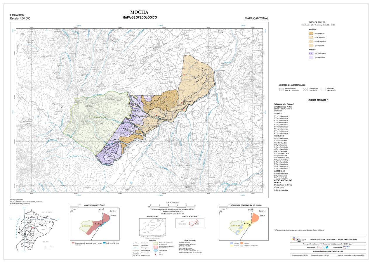 El mapa de Geopedología a escala 1:25.000, con formato vector, se genera en el marco del proyecto de 'Levantamiento de cartografía temática a escala 1:25.000, Lotes 1 y 2', realizado por el Consorcio TRACASA-NIPSA por contrato de la UE MAGAP PRAT - SIGTIERRAS, Programa del Ministerio de Agricultura, Ganadería, Acuacultura y Pesca (MAGAP). Esta cartografía contiene información sobre las características y propiedades de los distintos tipos de suelos que existen en el cantón 'MOCHA', su clasificación y sus límites en el mapa. En la metodología utilizada se sigue un enfoque geopedológico, basado en la alta correlación que existe entre la geomorfología (formas de relieve) y el suelo. Para la clasificación taxonómica de los suelos se siguen los criterios de la SoilTaxonomy (Claves para la Taxonomía de Suelos, 2006 y 2010), tomando como unidad taxonómica de clasificación el subgrupo y como unidad cartográfica el perfil modal o perfil característico de la unidad edáfica. La base de datos geopedológica consta de 14 variables derivadas de estos resultados de laboratorio para las zonas de semidetalle; en reconocimiento las mismas tienen datos de laboratorio complementadas con datos adquiridos de la información secundaria.