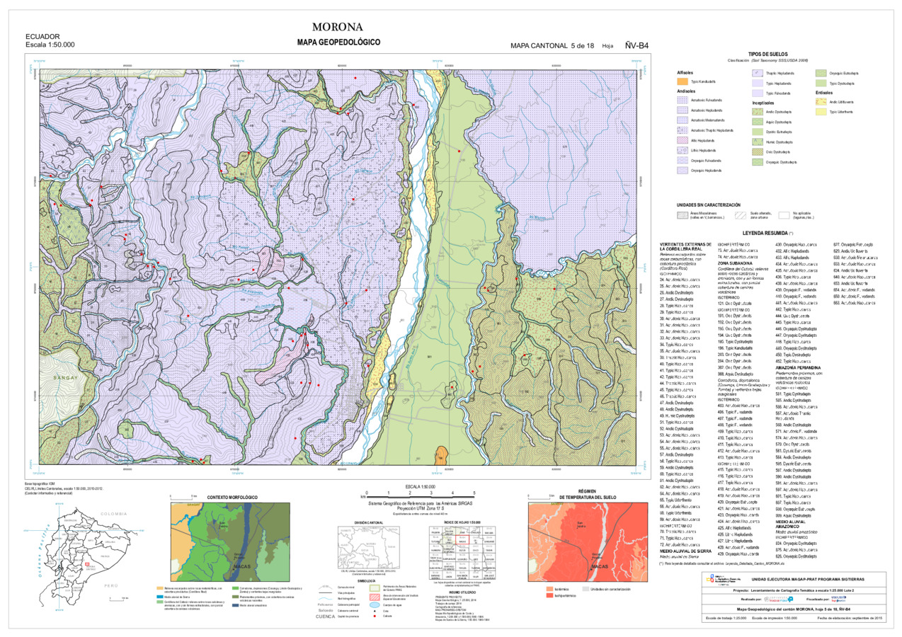El mapa de Geopedología a escala 1:25.000, con formato vector, se genera en el marco del proyecto de 'Levantamiento de cartografía temática a escala 1:25.000, Lotes 1 y 2', realizado por el Consorcio TRACASA-NIPSA por contrato de la UE MAGAP PRAT - SIGTIERRAS, Programa del Ministerio de Agricultura, Ganadería, Acuacultura y Pesca (MAGAP). Esta cartografía contiene información sobre las características y propiedades de los distintos tipos de suelos que existen en el cantón 'MORONA', su clasificación y sus límites en el mapa. En la metodología utilizada se sigue un enfoque geopedológico, basado en la alta correlación que existe entre la geomorfología (formas de relieve) y el suelo. Para la clasificación taxonómica de los suelos se siguen los criterios de la SoilTaxonomy (Claves para la Taxonomía de Suelos, 2006 y 2010), tomando como unidad taxonómica de clasificación el subgrupo y como unidad cartográfica el perfil modal o perfil característico de la unidad edáfica. La base de datos geopedológica consta de 14 variables derivadas de estos resultados de laboratorio para las zonas de semidetalle; en reconocimiento las mismas tienen datos de laboratorio complementadas con datos adquiridos de la información secundaria.