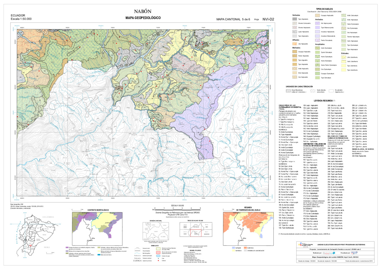 El mapa de Geopedología a escala 1:25.000, con formato vector, se genera en el marco del proyecto de 'Levantamiento de cartografía temática a escala 1:25.000, Lotes 1 y 2', realizado por el Consorcio TRACASA-NIPSA por contrato de la UE MAGAP PRAT - SIGTIERRAS, Programa del Ministerio de Agricultura, Ganadería, Acuacultura y Pesca (MAGAP). Esta cartografía contiene información sobre las características y propiedades de los distintos tipos de suelos que existen en el cantón 'NABON', su clasificación y sus límites en el mapa. En la metodología utilizada se sigue un enfoque geopedológico, basado en la alta correlación que existe entre la geomorfología (formas de relieve) y el suelo. Para la clasificación taxonómica de los suelos se siguen los criterios de la SoilTaxonomy (Claves para la Taxonomía de Suelos, 2006 y 2010), tomando como unidad taxonómica de clasificación el subgrupo y como unidad cartográfica el perfil modal o perfil característico de la unidad edáfica. La base de datos geopedológica consta de 14 variables derivadas de estos resultados de laboratorio para las zonas de semidetalle; en reconocimiento las mismas tienen datos de laboratorio complementadas con datos adquiridos de la información secundaria.