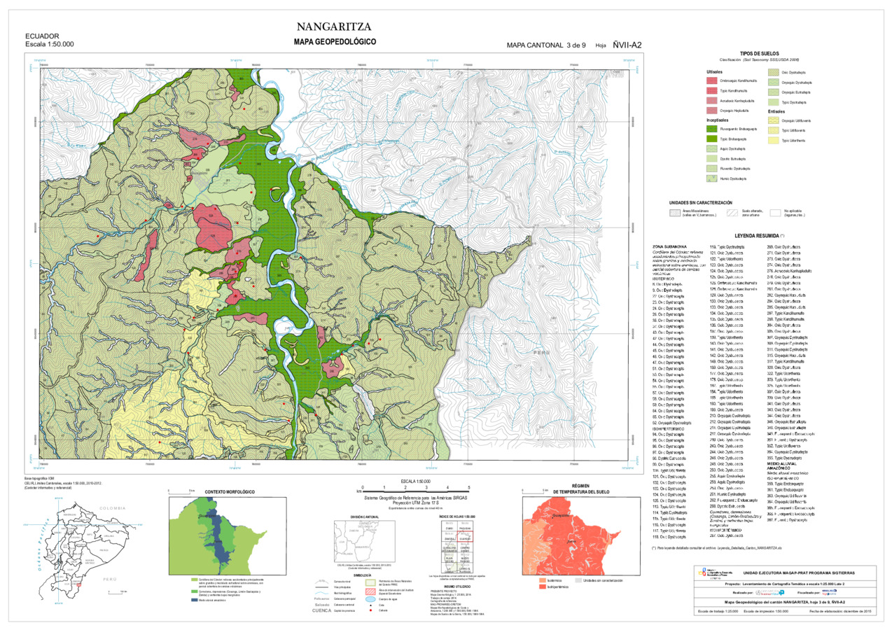 El mapa de Geopedología a escala 1:25.000, con formato vector, se genera en el marco del proyecto de 'Levantamiento de cartografía temática a escala 1:25.000, Lotes 1 y 2', realizado por el Consorcio TRACASA-NIPSA por contrato de la UE MAGAP PRAT - SIGTIERRAS, Programa del Ministerio de Agricultura, Ganadería, Acuacultura y Pesca (MAGAP). Esta cartografía contiene información sobre las características y propiedades de los distintos tipos de suelos que existen en el cantón 'NANGARITZA', su clasificación y sus límites en el mapa. En la metodología utilizada se sigue un enfoque geopedológico, basado en la alta correlación que existe entre la geomorfología (formas de relieve) y el suelo. Para la clasificación taxonómica de los suelos se siguen los criterios de la SoilTaxonomy (Claves para la Taxonomía de Suelos, 2006 y 2010), tomando como unidad taxonómica de clasificación el subgrupo y como unidad cartográfica el perfil modal o perfil característico de la unidad edáfica. La base de datos geopedológica consta de 14 variables derivadas de estos resultados de laboratorio para las zonas de semidetalle; en reconocimiento las mismas tienen datos de laboratorio complementadas con datos adquiridos de la información secundaria.