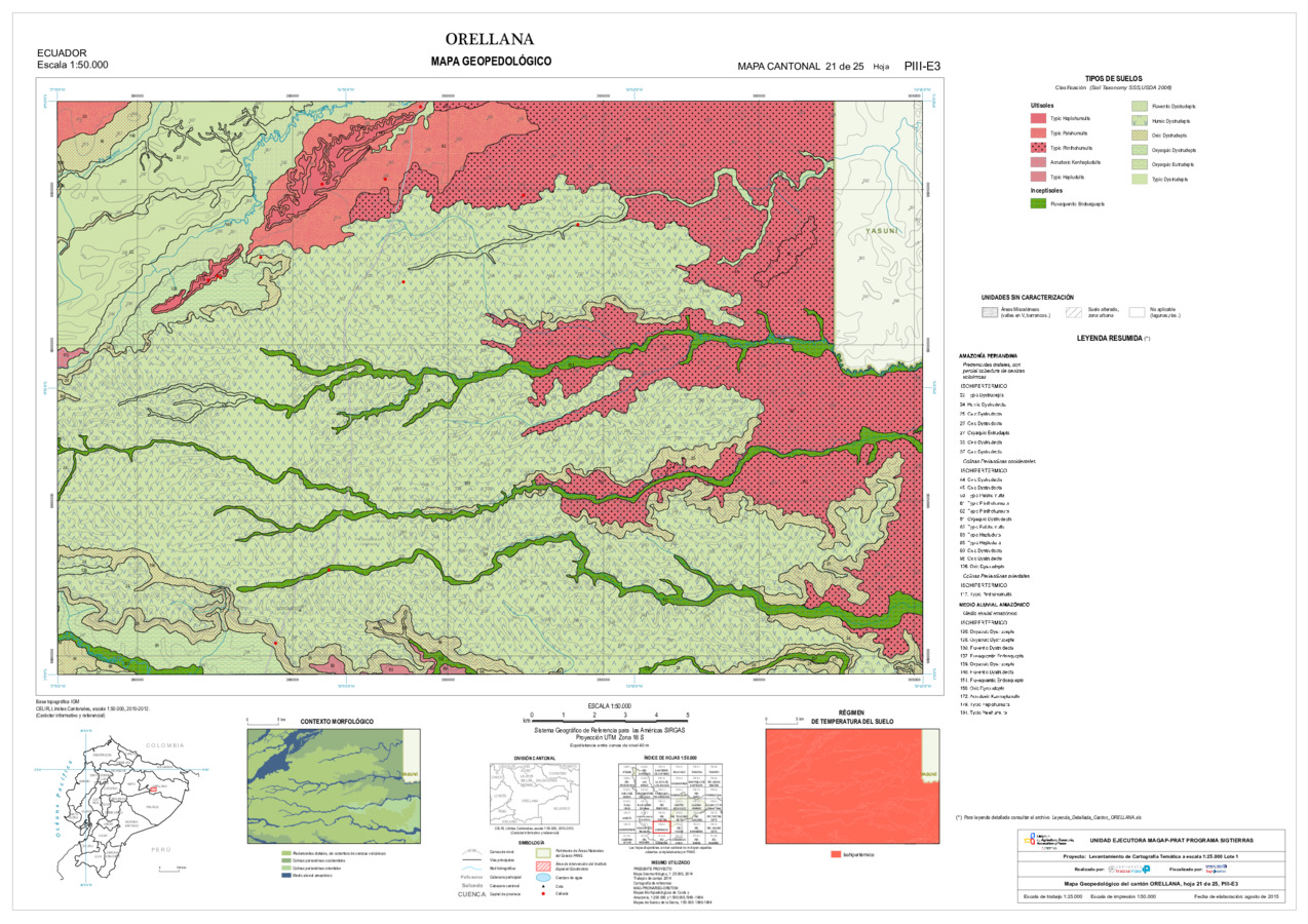 El mapa de Geopedología a escala 1:25.000, con formato vector, se genera en el marco del proyecto de 'Levantamiento de cartografía temática a escala 1:25.000, Lotes 1 y 2', realizado por el Consorcio TRACASA-NIPSA por contrato de la UE MAGAP PRAT - SIGTIERRAS, Programa del Ministerio de Agricultura, Ganadería, Acuacultura y Pesca (MAGAP). Esta cartografía contiene información sobre las características y propiedades de los distintos tipos de suelos que existen en el cantón 'ORELLANA', su clasificación y sus límites en el mapa. En la metodología utilizada se sigue un enfoque geopedológico, basado en la alta correlación que existe entre la geomorfología (formas de relieve) y el suelo. Para la clasificación taxonómica de los suelos se siguen los criterios de la SoilTaxonomy (Claves para la Taxonomía de Suelos, 2006 y 2010), tomando como unidad taxonómica de clasificación el subgrupo y como unidad cartográfica el perfil modal o perfil característico de la unidad edáfica. La base de datos geopedológica consta de 14 variables derivadas de estos resultados de laboratorio para las zonas de semidetalle; en reconocimiento las mismas tienen datos de laboratorio complementadas con datos adquiridos de la información secundaria.