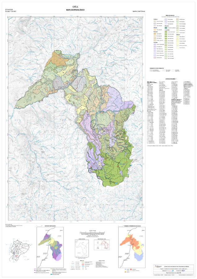 El mapa de Geopedología a escala 1:25.000, con formato vector, se genera en el marco del proyecto de 'Levantamiento de cartografía temática a escala 1:25.000, Lotes 1 y 2', realizado por el Consorcio TRACASA-NIPSA por contrato de la UE MAGAP PRAT - SIGTIERRAS, Programa del Ministerio de Agricultura, Ganadería, Acuacultura y Pesca (MAGAP). Esta cartografía contiene información sobre las características y propiedades de los distintos tipos de suelos que existen en el cantón 'OÑA', su clasificación y sus límites en el mapa. En la metodología utilizada se sigue un enfoque geopedológico, basado en la alta correlación que existe entre la geomorfología (formas de relieve) y el suelo. Para la clasificación taxonómica de los suelos se siguen los criterios de la SoilTaxonomy (Claves para la Taxonomía de Suelos, 2006 y 2010), tomando como unidad taxonómica de clasificación el subgrupo y como unidad cartográfica el perfil modal o perfil característico de la unidad edáfica. La base de datos geopedológica consta de 14 variables derivadas de estos resultados de laboratorio para las zonas de semidetalle; en reconocimiento las mismas tienen datos de laboratorio complementadas con datos adquiridos de la información secundaria.
