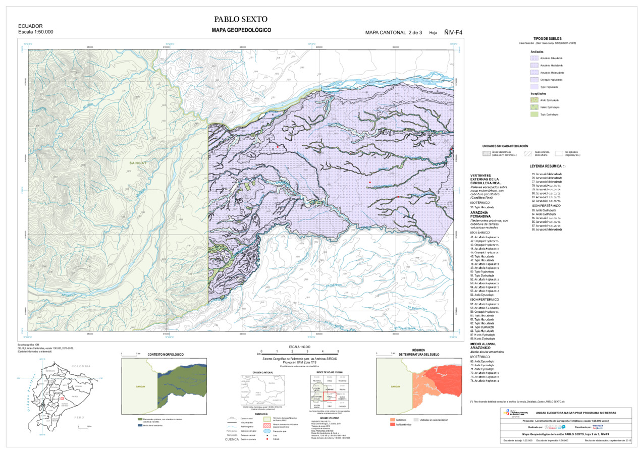 El mapa de Geopedología a escala 1:25.000, con formato vector, se genera en el marco del proyecto de 'Levantamiento de cartografía temática a escala 1:25.000, Lotes 1 y 2', realizado por el Consorcio TRACASA-NIPSA por contrato de la UE MAGAP PRAT - SIGTIERRAS, Programa del Ministerio de Agricultura, Ganadería, Acuacultura y Pesca (MAGAP). Esta cartografía contiene información sobre las características y propiedades de los distintos tipos de suelos que existen en el cantón 'PABLO SEXTO', su clasificación y sus límites en el mapa. En la metodología utilizada se sigue un enfoque geopedológico, basado en la alta correlación que existe entre la geomorfología (formas de relieve) y el suelo. Para la clasificación taxonómica de los suelos se siguen los criterios de la SoilTaxonomy (Claves para la Taxonomía de Suelos, 2006 y 2010), tomando como unidad taxonómica de clasificación el subgrupo y como unidad cartográfica el perfil modal o perfil característico de la unidad edáfica. La base de datos geopedológica consta de 14 variables derivadas de estos resultados de laboratorio para las zonas de semidetalle; en reconocimiento las mismas tienen datos de laboratorio complementadas con datos adquiridos de la información secundaria.