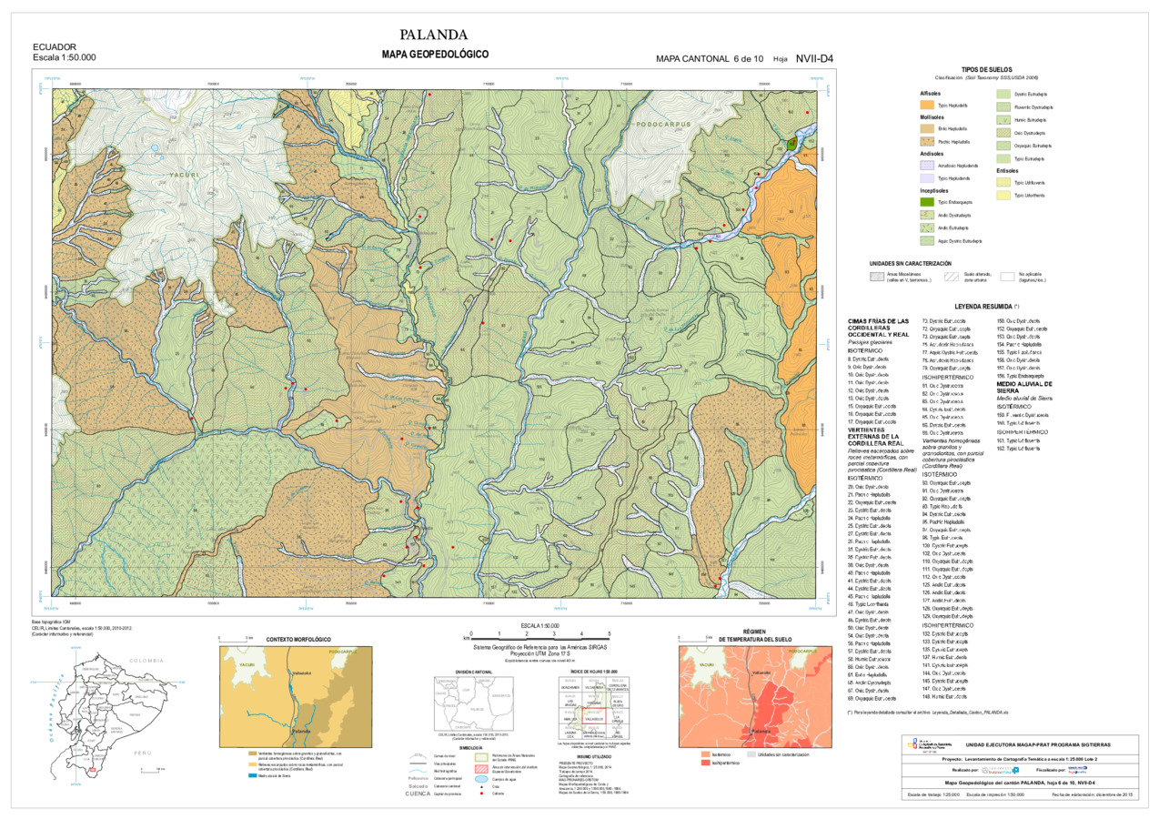 El mapa de Geopedología a escala 1:25.000, con formato vector, se genera en el marco del proyecto de 'Levantamiento de cartografía temática a escala 1:25.000, Lotes 1 y 2', realizado por el Consorcio TRACASA-NIPSA por contrato de la UE MAGAP PRAT - SIGTIERRAS, Programa del Ministerio de Agricultura, Ganadería, Acuacultura y Pesca (MAGAP). Esta cartografía contiene información sobre las características y propiedades de los distintos tipos de suelos que existen en el cantón 'PALANDA', su clasificación y sus límites en el mapa. En la metodología utilizada se sigue un enfoque geopedológico, basado en la alta correlación que existe entre la geomorfología (formas de relieve) y el suelo. Para la clasificación taxonómica de los suelos se siguen los criterios de la SoilTaxonomy (Claves para la Taxonomía de Suelos, 2006 y 2010), tomando como unidad taxonómica de clasificación el subgrupo y como unidad cartográfica el perfil modal o perfil característico de la unidad edáfica. La base de datos geopedológica consta de 14 variables derivadas de estos resultados de laboratorio para las zonas de semidetalle; en reconocimiento las mismas tienen datos de laboratorio complementadas con datos adquiridos de la información secundaria.