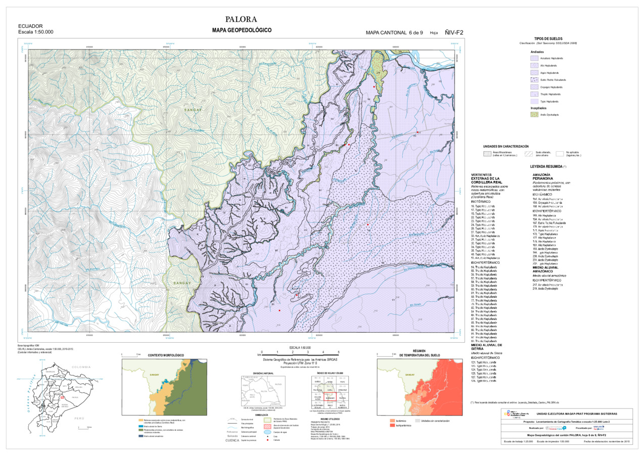 El mapa de Geopedología a escala 1:25.000, con formato vector, se genera en el marco del proyecto de 'Levantamiento de cartografía temática a escala 1:25.000, Lotes 1 y 2', realizado por el Consorcio TRACASA-NIPSA por contrato de la UE MAGAP PRAT - SIGTIERRAS, Programa del Ministerio de Agricultura, Ganadería, Acuacultura y Pesca (MAGAP). Esta cartografía contiene información sobre las características y propiedades de los distintos tipos de suelos que existen en el cantón 'PALORA', su clasificación y sus límites en el mapa. En la metodología utilizada se sigue un enfoque geopedológico, basado en la alta correlación que existe entre la geomorfología (formas de relieve) y el suelo. Para la clasificación taxonómica de los suelos se siguen los criterios de la SoilTaxonomy (Claves para la Taxonomía de Suelos, 2006 y 2010), tomando como unidad taxonómica de clasificación el subgrupo y como unidad cartográfica el perfil modal o perfil característico de la unidad edáfica. La base de datos geopedológica consta de 14 variables derivadas de estos resultados de laboratorio para las zonas de semidetalle; en reconocimiento las mismas tienen datos de laboratorio complementadas con datos adquiridos de la información secundaria.