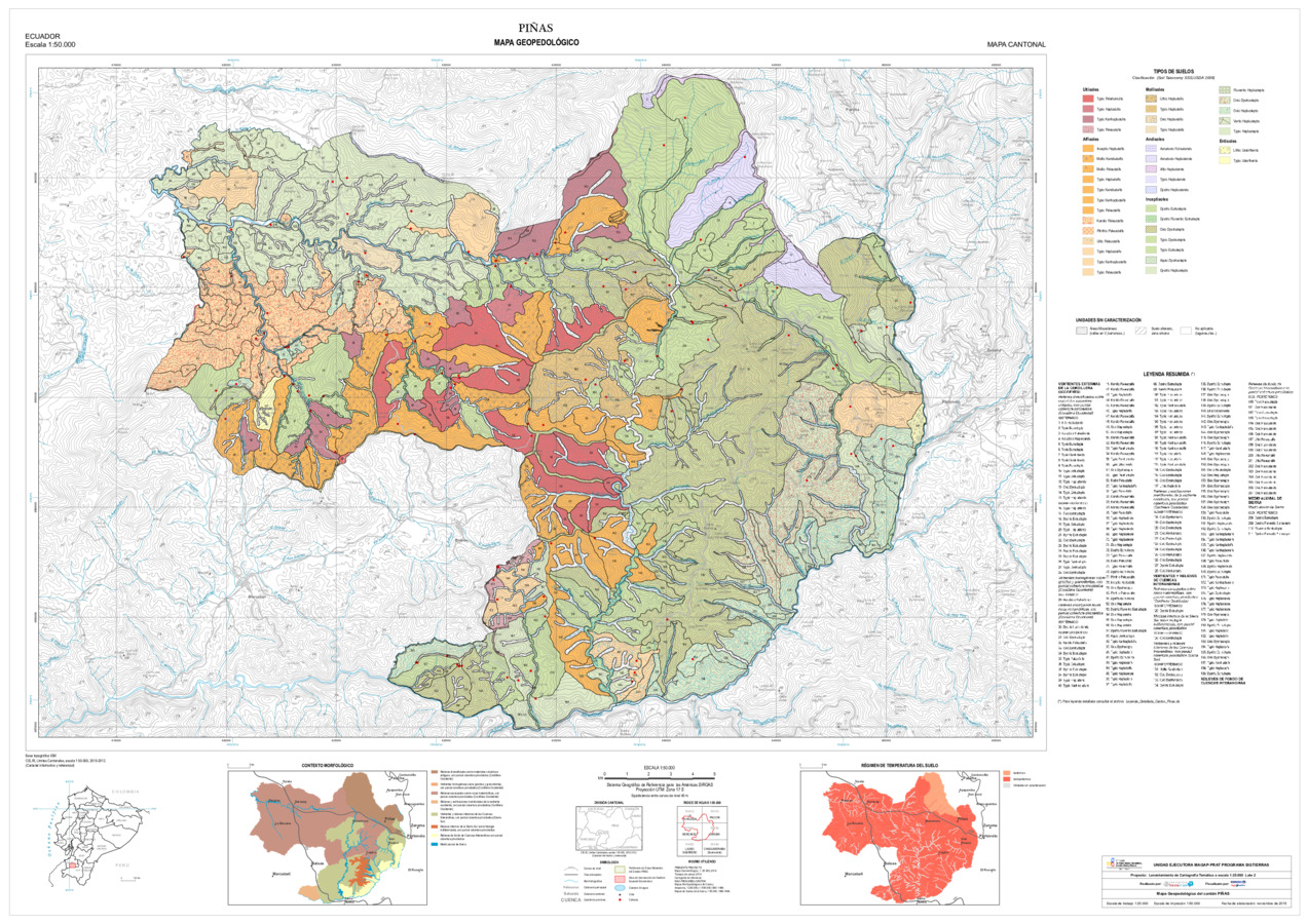El mapa de Geopedología a escala 1:25.000, con formato vector, se genera en el marco del proyecto de 'Levantamiento de cartografía temática a escala 1:25.000, Lotes 1 y 2', realizado por el Consorcio TRACASA-NIPSA por contrato de la UE MAGAP PRAT - SIGTIERRAS, Programa del Ministerio de Agricultura, Ganadería, Acuacultura y Pesca (MAGAP). Esta cartografía contiene información sobre las características y propiedades de los distintos tipos de suelos que existen en el cantón 'PIÑAS', su clasificación y sus límites en el mapa. En la metodología utilizada se sigue un enfoque geopedológico, basado en la alta correlación que existe entre la geomorfología (formas de relieve) y el suelo. Para la clasificación taxonómica de los suelos se siguen los criterios de la SoilTaxonomy (Claves para la Taxonomía de Suelos, 2006 y 2010), tomando como unidad taxonómica de clasificación el subgrupo y como unidad cartográfica el perfil modal o perfil característico de la unidad edáfica. La base de datos geopedológica consta de 14 variables derivadas de estos resultados de laboratorio para las zonas de semidetalle; en reconocimiento las mismas tienen datos de laboratorio complementadas con datos adquiridos de la información secundaria.
