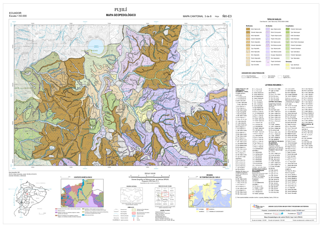 El mapa de Geopedología a escala 1:25.000, con formato vector, se genera en el marco del proyecto de 'Levantamiento de cartografía temática a escala 1:25.000, Lotes 1 y 2', realizado por el Consorcio TRACASA-NIPSA por contrato de la UE MAGAP PRAT - SIGTIERRAS, Programa del Ministerio de Agricultura, Ganadería, Acuacultura y Pesca (MAGAP). Esta cartografía contiene información sobre las características y propiedades de los distintos tipos de suelos que existen en el cantón 'PUJILI', su clasificación y sus límites en el mapa. En la metodología utilizada se sigue un enfoque geopedológico, basado en la alta correlación que existe entre la geomorfología (formas de relieve) y el suelo. Para la clasificación taxonómica de los suelos se siguen los criterios de la SoilTaxonomy (Claves para la Taxonomía de Suelos, 2006 y 2010), tomando como unidad taxonómica de clasificación el subgrupo y como unidad cartográfica el perfil modal o perfil característico de la unidad edáfica. La base de datos geopedológica consta de 14 variables derivadas de estos resultados de laboratorio para las zonas de semidetalle; en reconocimiento las mismas tienen datos de laboratorio complementadas con datos adquiridos de la información secundaria.