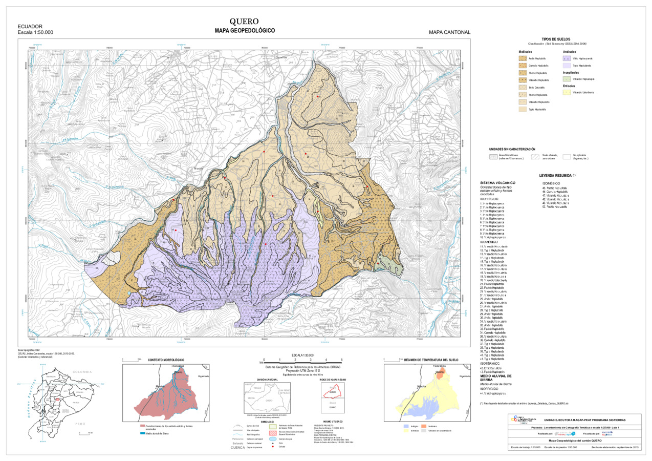 El mapa de Geopedología a escala 1:25.000, con formato vector, se genera en el marco del proyecto de 'Levantamiento de cartografía temática a escala 1:25.000, Lotes 1 y 2', realizado por el Consorcio TRACASA-NIPSA por contrato de la UE MAGAP PRAT - SIGTIERRAS, Programa del Ministerio de Agricultura, Ganadería, Acuacultura y Pesca (MAGAP). Esta cartografía contiene información sobre las características y propiedades de los distintos tipos de suelos que existen en el cantón 'QUERO', su clasificación y sus límites en el mapa. En la metodología utilizada se sigue un enfoque geopedológico, basado en la alta correlación que existe entre la geomorfología (formas de relieve) y el suelo. Para la clasificación taxonómica de los suelos se siguen los criterios de la SoilTaxonomy (Claves para la Taxonomía de Suelos, 2006 y 2010), tomando como unidad taxonómica de clasificación el subgrupo y como unidad cartográfica el perfil modal o perfil característico de la unidad edáfica. La base de datos geopedológica consta de 14 variables derivadas de estos resultados de laboratorio para las zonas de semidetalle; en reconocimiento las mismas tienen datos de laboratorio complementadas con datos adquiridos de la información secundaria.