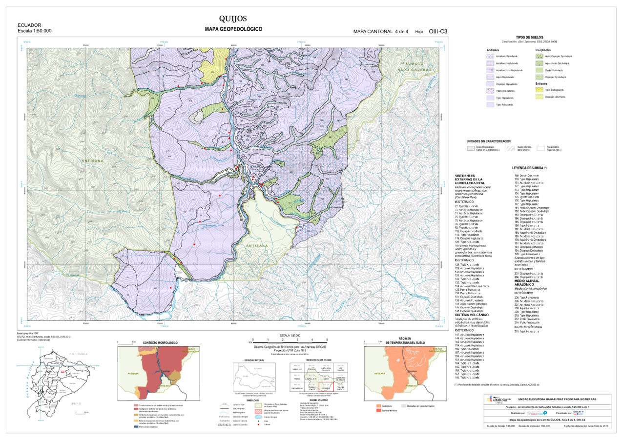 El mapa de Geopedología a escala 1:25.000, con formato vector, se genera en el marco del proyecto de 'Levantamiento de cartografía temática a escala 1:25.000, Lotes 1 y 2', realizado por el Consorcio TRACASA-NIPSA por contrato de la UE MAGAP PRAT - SIGTIERRAS, Programa del Ministerio de Agricultura, Ganadería, Acuacultura y Pesca (MAGAP). Esta cartografía contiene información sobre las características y propiedades de los distintos tipos de suelos que existen en el cantón 'QUIJOS', su clasificación y sus límites en el mapa. En la metodología utilizada se sigue un enfoque geopedológico, basado en la alta correlación que existe entre la geomorfología (formas de relieve) y el suelo. Para la clasificación taxonómica de los suelos se siguen los criterios de la SoilTaxonomy (Claves para la Taxonomía de Suelos, 2006 y 2010), tomando como unidad taxonómica de clasificación el subgrupo y como unidad cartográfica el perfil modal o perfil característico de la unidad edáfica. La base de datos geopedológica consta de 14 variables derivadas de estos resultados de laboratorio para las zonas de semidetalle; en reconocimiento las mismas tienen datos de laboratorio complementadas con datos adquiridos de la información secundaria.