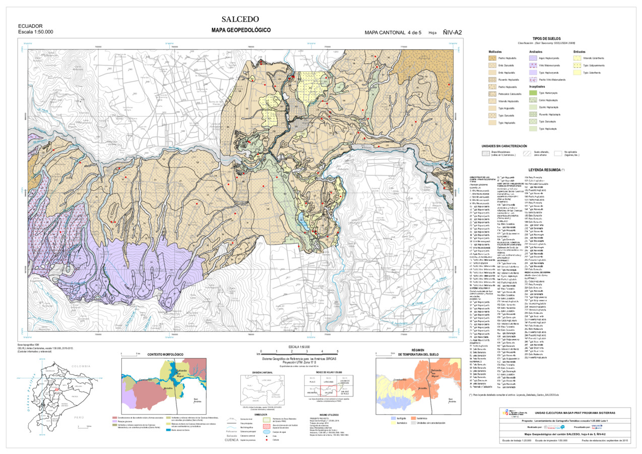El mapa de Geopedología a escala 1:25.000, con formato vector, se genera en el marco del proyecto de 'Levantamiento de cartografía temática a escala 1:25.000, Lotes 1 y 2', realizado por el Consorcio TRACASA-NIPSA por contrato de la UE MAGAP PRAT - SIGTIERRAS, Programa del Ministerio de Agricultura, Ganadería, Acuacultura y Pesca (MAGAP). Esta cartografía contiene información sobre las características y propiedades de los distintos tipos de suelos que existen en el cantón 'SALCEDO', su clasificación y sus límites en el mapa. En la metodología utilizada se sigue un enfoque geopedológico, basado en la alta correlación que existe entre la geomorfología (formas de relieve) y el suelo. Para la clasificación taxonómica de los suelos se siguen los criterios de la SoilTaxonomy (Claves para la Taxonomía de Suelos, 2006 y 2010), tomando como unidad taxonómica de clasificación el subgrupo y como unidad cartográfica el perfil modal o perfil característico de la unidad edáfica. La base de datos geopedológica consta de 14 variables derivadas de estos resultados de laboratorio para las zonas de semidetalle; en reconocimiento las mismas tienen datos de laboratorio complementadas con datos adquiridos de la información secundaria.