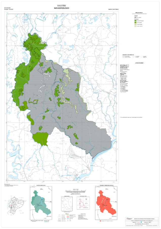 El mapa de Geopedología a escala 1:25.000, con formato vector, se genera en el marco del proyecto de 'Levantamiento de cartografía temática a escala 1:25.000, Lotes 1 y 2', realizado por el Consorcio TRACASA-NIPSA por contrato de la UE MAGAP PRAT - SIGTIERRAS, Programa del Ministerio de Agricultura, Ganadería, Acuacultura y Pesca (MAGAP). Esta cartografía contiene información sobre las características y propiedades de los distintos tipos de suelos que existen en el cantón 'SALITRE', su clasificación y sus límites en el mapa. En la metodología utilizada se sigue un enfoque geopedológico, basado en la alta correlación que existe entre la geomorfología (formas de relieve) y el suelo. Para la clasificación taxonómica de los suelos se siguen los criterios de la SoilTaxonomy (Claves para la Taxonomía de Suelos, 2006 y 2010), tomando como unidad taxonómica de clasificación el subgrupo y como unidad cartográfica el perfil modal o perfil característico de la unidad edáfica. La base de datos geopedológica consta de 14 variables derivadas de estos resultados de laboratorio para las zonas de semidetalle; en reconocimiento las mismas tienen datos de laboratorio complementadas con datos adquiridos de la información secundaria.