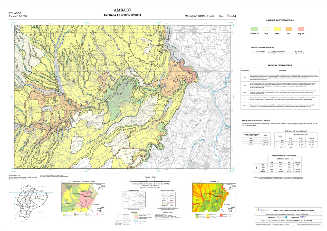 El mapa de Amenaza a erosión hídrica, con formato vector, se genera dentro del proyecto 'Levantamiento de cartografía temática a escala 1:25.000, Lotes 1 y 2', realizado por el Consorcio TRACASA-NIPSA por contrato de la UE MAGAP PRAT - SIGTIERRAS, Programa del Ministerio de Agricultura, Ganadería, Acuacultura y Pesca (MAGAP). Esta cartografía contiene información sobre la posibilidad de ocurrencia de erosión hídrica en la unidad de estudio, la unidad edáfica, del cantón 'AMBATO'.