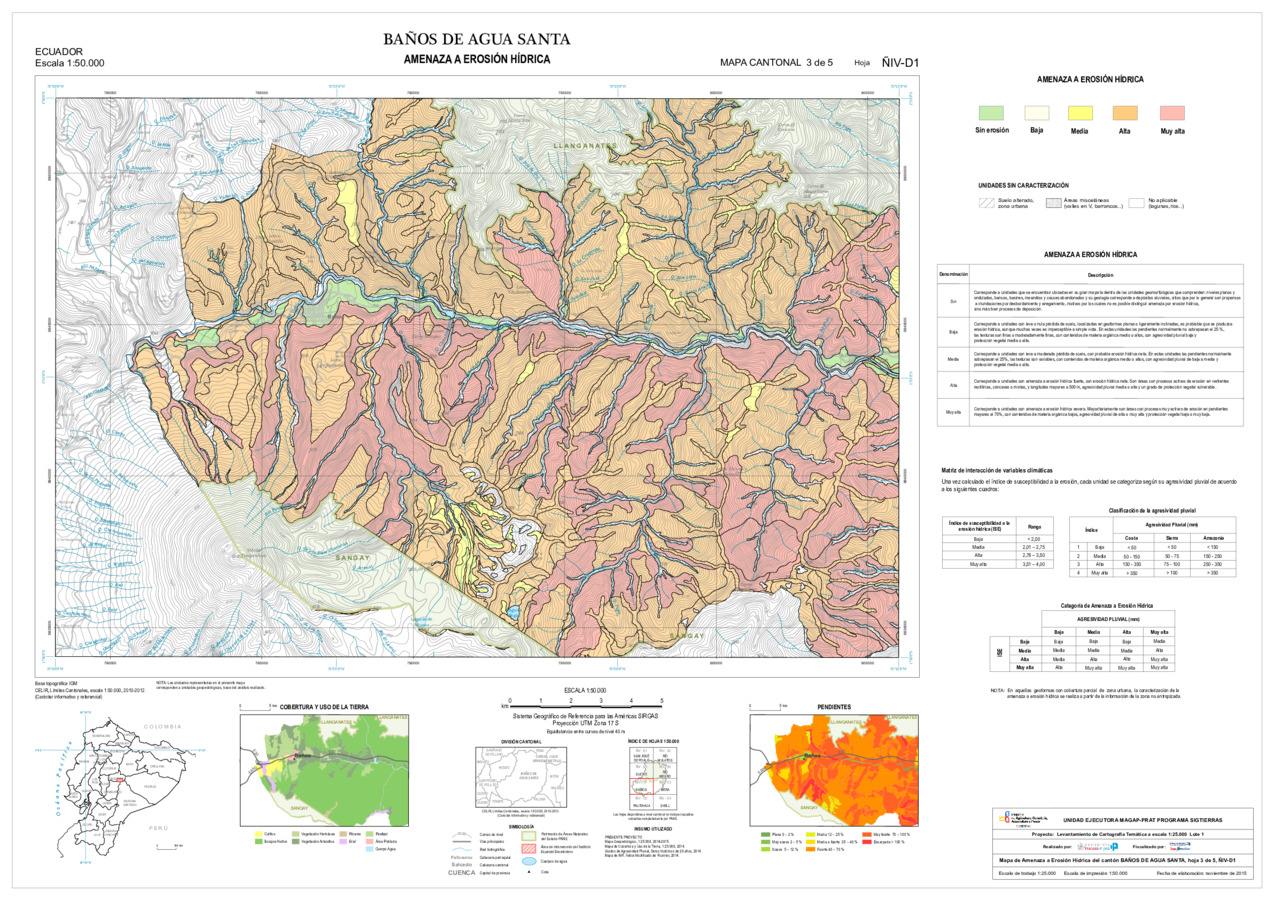 El mapa de Amenaza a erosión hídrica, con formato vector, se genera dentro del proyecto 'Levantamiento de cartografía temática a escala 1:25.000, Lotes 1 y 2', realizado por el Consorcio TRACASA-NIPSA por contrato de la UE MAGAP PRAT - SIGTIERRAS, Programa del Ministerio de Agricultura, Ganadería, Acuacultura y Pesca (MAGAP). Esta cartografía contiene información sobre la posibilidad de ocurrencia de erosión hídrica en la unidad de estudio, la unidad edáfica, del cantón 'BAÑOS DE AGUA SANTA'.