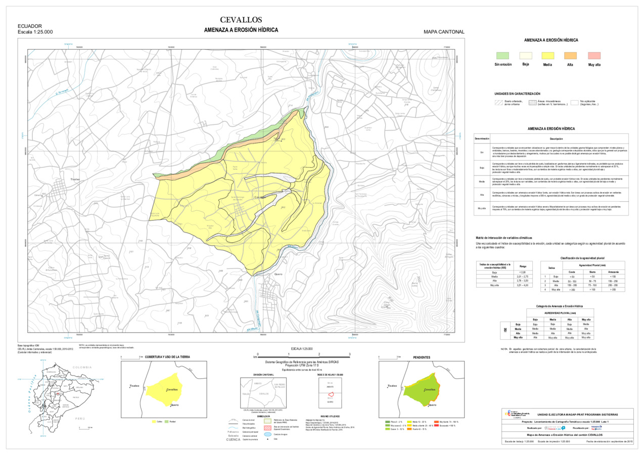 El mapa de Amenaza a erosión hídrica, con formato vector, se genera dentro del proyecto 'Levantamiento de cartografía temática a escala 1:25.000, Lotes 1 y 2', realizado por el Consorcio TRACASA-NIPSA por contrato de la UE MAGAP PRAT - SIGTIERRAS, Programa del Ministerio de Agricultura, Ganadería, Acuacultura y Pesca (MAGAP). Esta cartografía contiene información sobre la posibilidad de ocurrencia de erosión hídrica en la unidad de estudio, la unidad edáfica, del cantón 'CEVALLOS'.