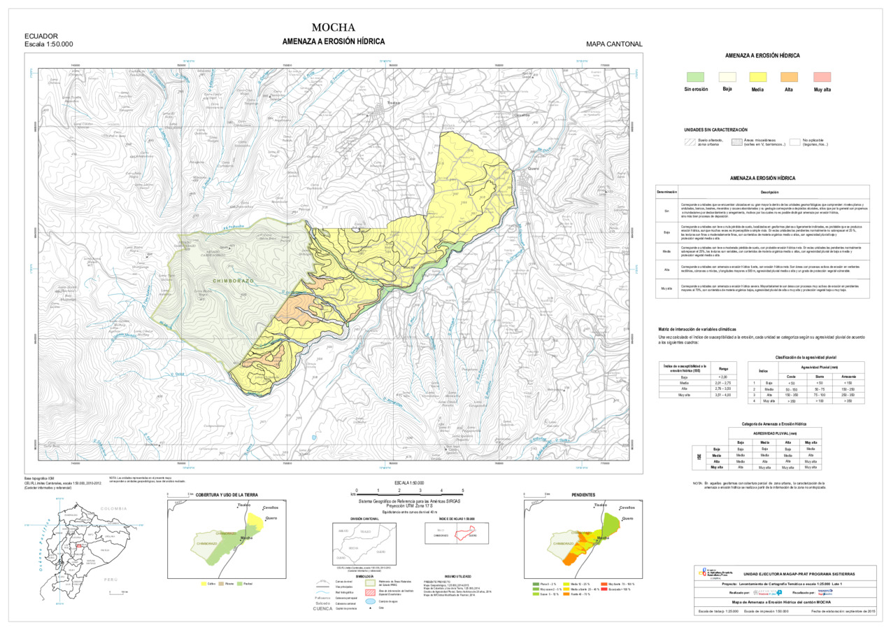 El mapa de Amenaza a erosión hídrica, con formato vector, se genera dentro del proyecto 'Levantamiento de cartografía temática a escala 1:25.000, Lotes 1 y 2', realizado por el Consorcio TRACASA-NIPSA por contrato de la UE MAGAP PRAT - SIGTIERRAS, Programa del Ministerio de Agricultura, Ganadería, Acuacultura y Pesca (MAGAP). Esta cartografía contiene información sobre la posibilidad de ocurrencia de erosión hídrica en la unidad de estudio, la unidad edáfica, del cantón 'MOCHA'.