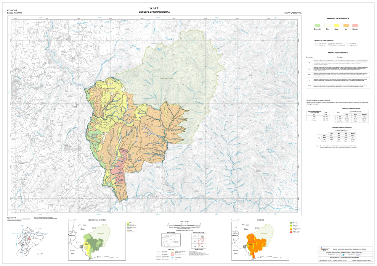 El mapa de Amenaza a erosión hídrica, con formato vector, se genera dentro del proyecto 'Levantamiento de cartografía temática a escala 1:25.000, Lotes 1 y 2', realizado por el Consorcio TRACASA-NIPSA por contrato de la UE MAGAP PRAT - SIGTIERRAS, Programa del Ministerio de Agricultura, Ganadería, Acuacultura y Pesca (MAGAP). Esta cartografía contiene información sobre la posibilidad de ocurrencia de erosión hídrica en la unidad de estudio, la unidad edáfica, del cantón 'PATATE'.