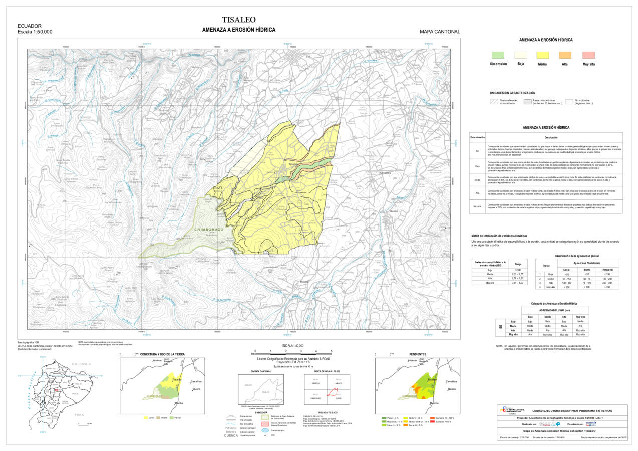 El mapa de Amenaza a erosión hídrica, con formato vector, se genera dentro del proyecto 'Levantamiento de cartografía temática a escala 1:25.000, Lotes 1 y 2', realizado por el Consorcio TRACASA-NIPSA por contrato de la UE MAGAP PRAT - SIGTIERRAS, Programa del Ministerio de Agricultura, Ganadería, Acuacultura y Pesca (MAGAP). Esta cartografía contiene información sobre la posibilidad de ocurrencia de erosión hídrica en la unidad de estudio, la unidad edáfica, del cantón 'TISALEO'.