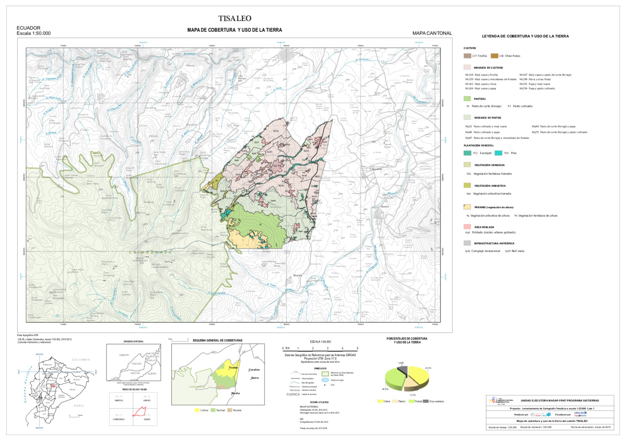 El mapa de cobertura y uso de la tierra a escala 1: 25000 con formato vector, es generado dentro del proyecto "Levantamiento de cartografía temática a escala 1:25.000, Lotes 1 y 2". Esta cartografía contiene información sobre todas las coberturas del territorio del cantón TISALEO incluyendo atributos como riego, tamaño de parcela, cubierta y el uso que se le da a una determinada cobertura. Además se recogen atributos de cobertura vegetal natural como el nivel de alteración.