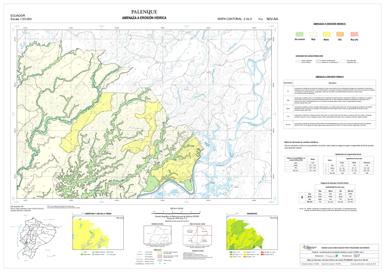 El mapa de Amenaza a erosión hídrica, con formato vector, se genera dentro del proyecto 'Levantamiento de cartografía temática a escala 1:25.000, Lotes 1 y 2', realizado por el Consorcio TRACASA-NIPSA por contrato de la UE MAGAP PRAT - SIGTIERRAS, Programa del Ministerio de Agricultura, Ganadería, Acuacultura y Pesca (MAGAP). Esta cartografía contiene información sobre la posibilidad de ocurrencia de erosión hídrica en la unidad de estudio, la unidad edáfica, del cantón 'PALENQUE'.